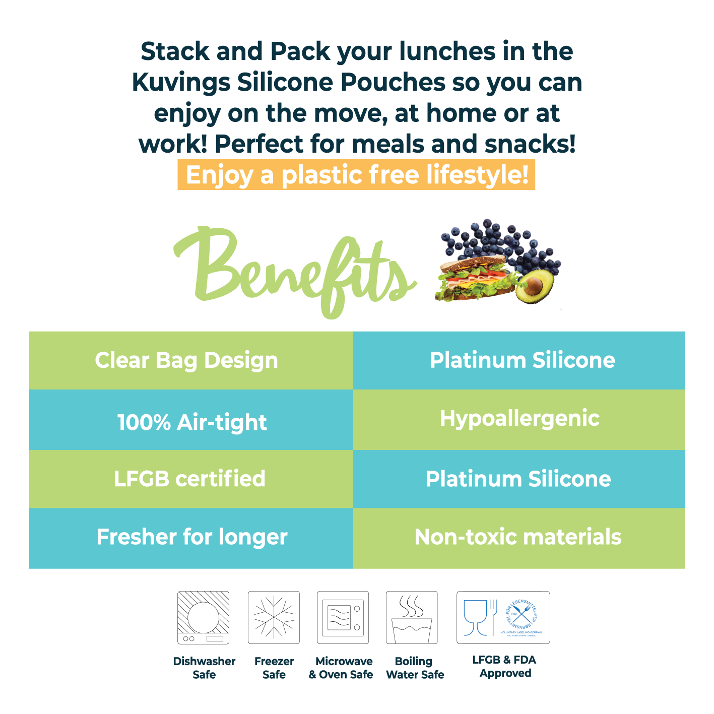 Introducing our brand new food storage solution for your meals, snacks and food prep to organise your fridge, pantry or when on the go! The Kuvings Stack & Pack Food Pouch Bags are reusable and use pure platinum silicone, making them food safe.